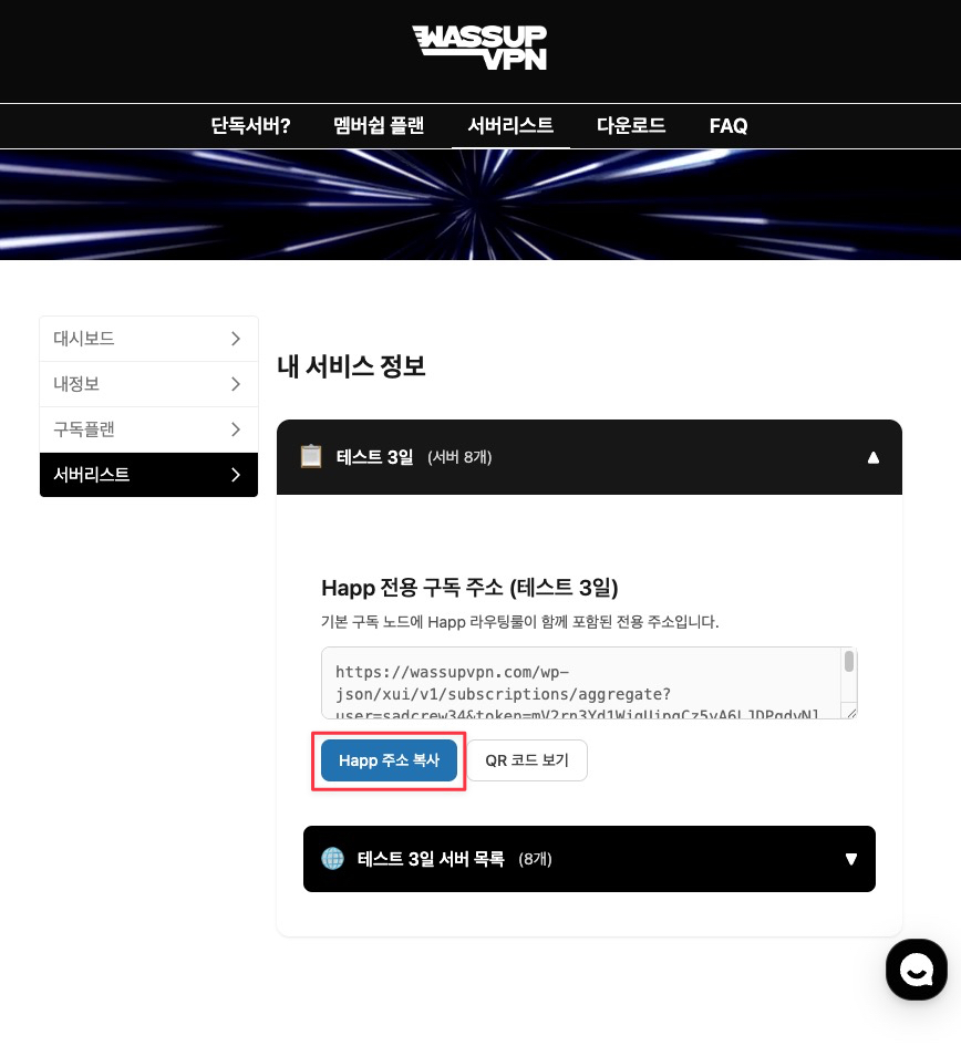 Happ 주소 복사 버튼 클릭