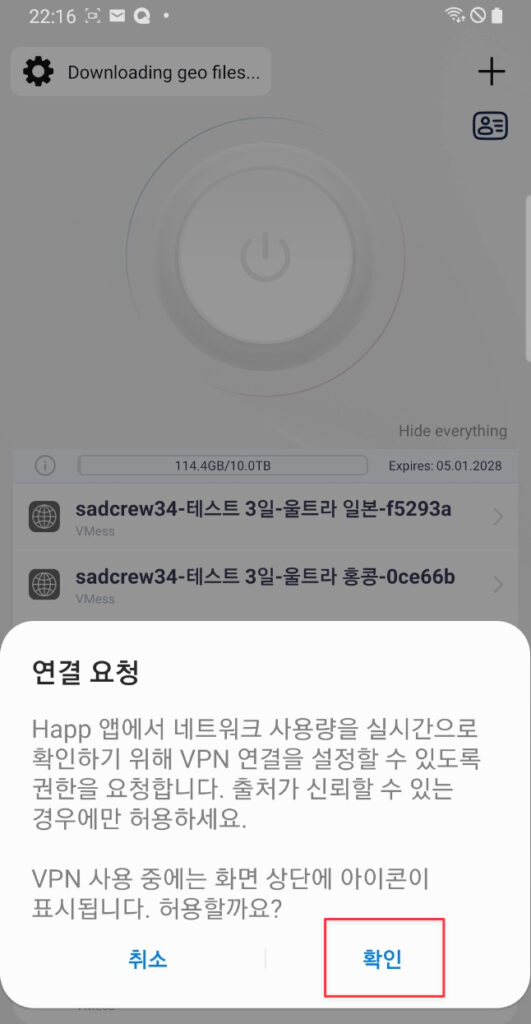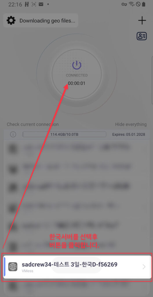 프로필 설치후 서버를 선택하고 버튼을 누르세요